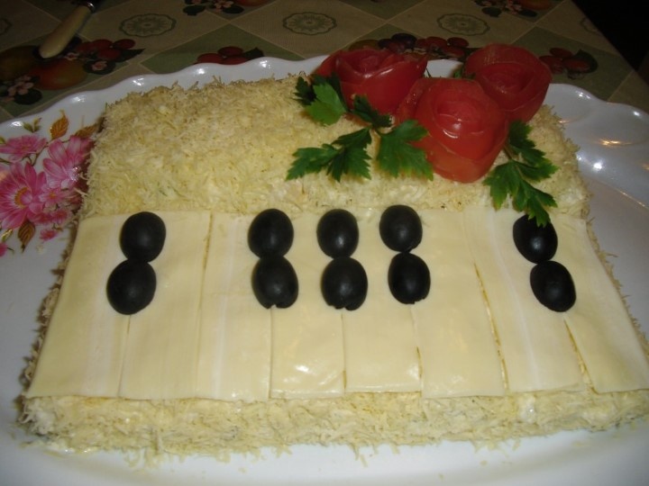 - Теперь нарезаем брусочками сыр и делаем из него клавиши. Также нарезаем маслины и делаем из них черные клавиши.