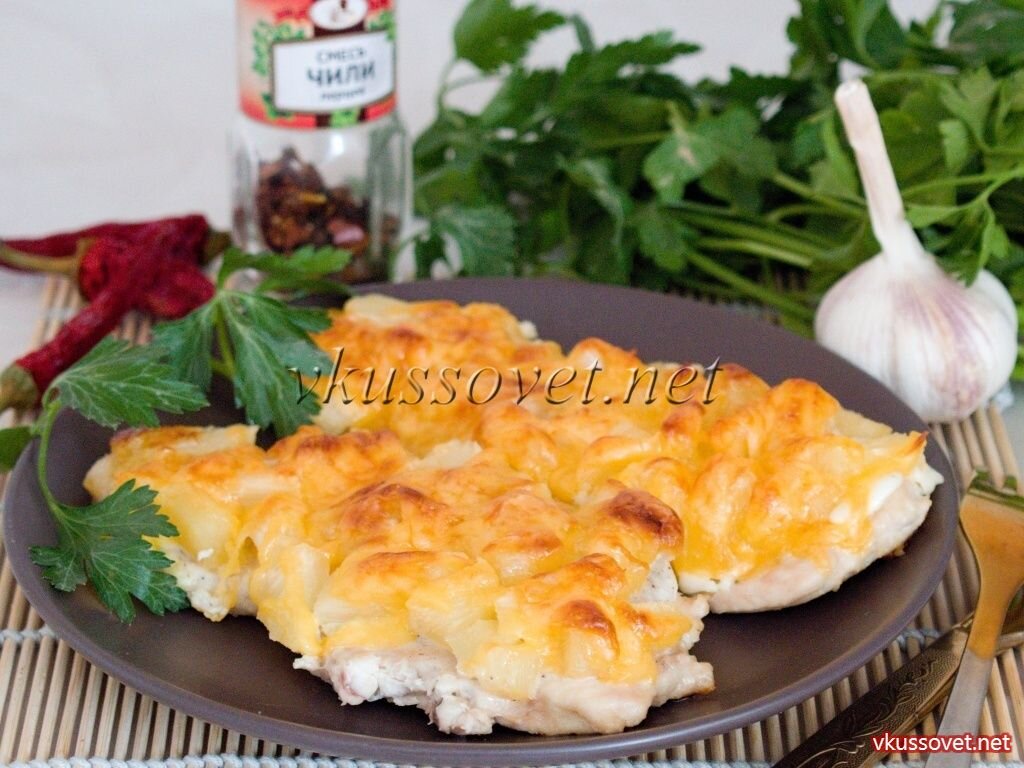 Рецепт приготовления куриной отбивной с консервированным ананасом и сыром. Великолепное сочетание куриного мяса, сладкого ананаса, сыра и чеснока – все это объединяется в одном простом блюде, которое к тому же легко и быстро готовится. Запеченная в духовке отбивная с ананасами и сыром всегда выглядит торжественно и вполне подходит к любому праздничному столу, семейному или романтическому ужину. Куриную отбивную можно подавать как самостоятельное блюдо или с легким гарниром – отварным рисом или овощами. Необходимые ингредиенты: - 1 куриная грудка; - 200 г. консервированного ананаса; - 100 г. сыра (твердого или полутвердого сорта); - 2 – 3 зубка чеснока; - 2 ст. ложки майонеза; - соль и перец по вкусу. Как приготовить: http://vkussovet.net/1371-kurinye-otbivnye-s-ananasom-i-syrom.html