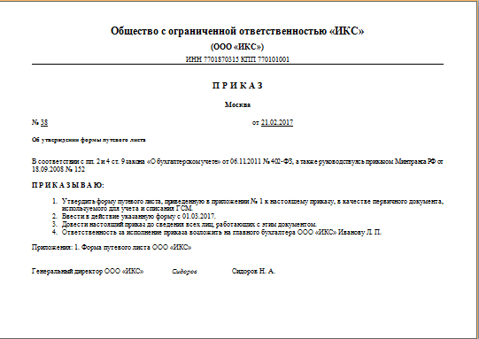 Допустим, ООО «ИКС» разработало свою форму путевого листа, но не прописало ее в учетной политике. В этом случае необходимо издать приказ об утверждении новой формы.