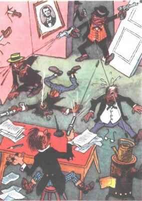 Оба пистолета грянули одновременно. Редактор потерял клок волос, а пуля полковника засела в мясистой части моего бедра. Полковнику оцарапало левое плечо. Они опять выстрелили. На этот раз ни тот, ни другой из противников не пострадал, а на мою долю кое—что досталось – пуля в плечо. При третьем выстреле оба джентльмена были легко ранены, а мне раздробило запястье. Тут я сказал, что, пожалуй, пойду прогуляюсь, так как это их личное дело и я считаю неделикатным в него вмешиваться. Однако оба джентльмена убедительно просили меня остаться и уверяли, что я нисколько им не мешаю.