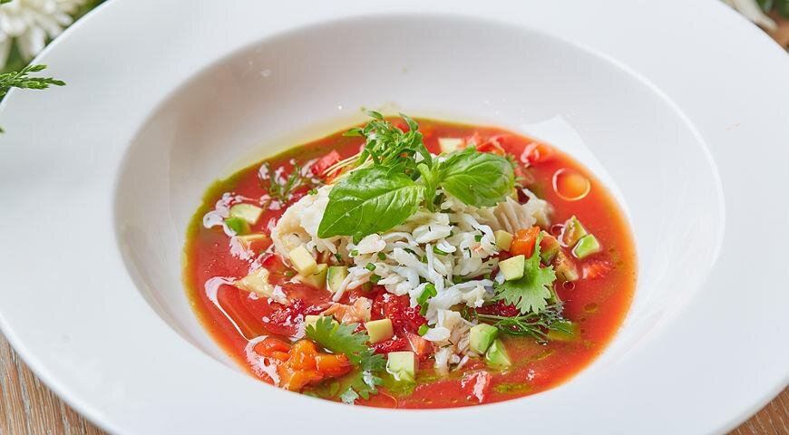Томатный суп гаспачо с печёным болгарским перцем, авокадо, мясом камчатского краба и тартаром из клубники