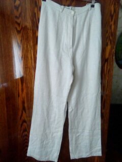 Штанишки действительно выглядели печально и из всех выдающихся достоинств имели три плюса. 1. Свой состав: натуральная ткань - лен. 2. Свои свойства: замечательный "летний" цвет. 3. Их моей подруге подарили. Почему печально, сейчас поймете, вот они "как есть". Натуральные, из хорошей ткани, но никакого "изюма" и полное отсутствие стиля и хотя бы малейших намеков на элегантность. Еще они были Татьяне коротковаты. Таня пришла ко мне и принесла штанишки. - Полечи. Я знаю, ты сможешь. Для вдохновения нужно время. На тот момент я была занята другим проектом. Поэтому штанишки еще неделю "пожили" у меня. Вдохновение и "искра" случились как всегда почти случайно. Мало того, что дизайн штанишек сложился у меня в голове практически моментально. Я еще встретила в этот день Оксану - мастерицу "золотые руки". Оксана всегда с большим энтузиазмом относится к моим предложениям и мы тогда вместе действительно "творим". Я - мозговой центр, генератор идей и вдохновитель. Оксана - моя команда и исполнит