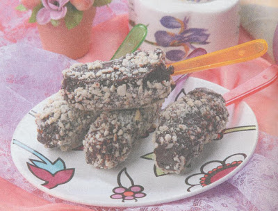 В половинки бананов аккуратно вставить пластмассовые палочки для мороженого. Столовой ложкой покрыть бананы растопленным шоколадом. Затем быстро, пока не застыла глазурь, обвалять полученные шоколадные бананы в растолченных орехах.