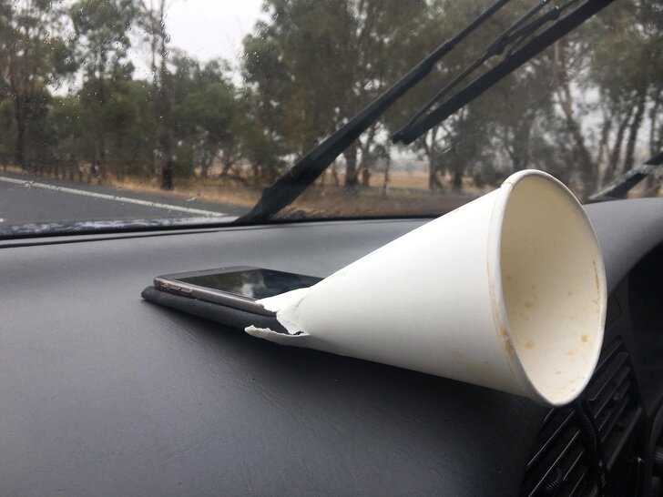 Если в машине радио не работает, а динамик в телефоне тихий, то возьмите стаканчик, разрежьте как на фото. Это отлично усилит звук.