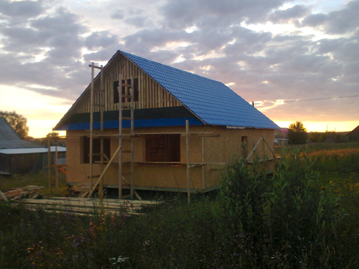 Продолжение 3 Предыдущие публикации Делаем крышу и кровлю. По центру ставим стойки как и на первом этаже. Затем крепим на получившуюся скамейку стропила. Теперь приступаем к обрешетке.На обрешетку обычно идёт доска дюймовка.Между стропилами расстояние один метр.Между досками обрешетки пять сантиметров. После монтажа обрешетки делаем каркас для обрешетки фронтона.Делается каркас одинаково и для фасадной части и для тыльной.С фасадной части оставляем проём для окна а с тыльной для дверки чтобы попадать на чердак. Внизу обрешетки фасадной части делаем козырёк.Можно и без него но дождь будет заливать стену и окна. Кровлю я делал из металлочерепицы.Вдвоём с женой справились.Лестница служит для доставки листа на крышу.Я сижу на коньке с верёвкой и тяну лист а жена снизу направляет.Легко и просто. Ну вот пожалуй и всё.На следующем этапе обшивка сайдингом. Андрей