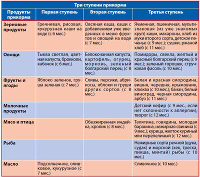 Есть понятие «вид прикорма», к которому относятся каши, овощи и мясо (фруктовое пюре, соки, творог и т. д. считаются не обязательными, а дополнительными продуктами). По классической схеме они должны появляться в меню ребенка именно в таком порядке — начиная самым легким для усвоения юным организмом (каши) к более тяжелому (мясные продукты). Если даже последовательность введения блюд меняется (об этом мы еще скажем), временной промежуток между ними должен быть соблюден. Он составляет 7-10 дней для малышей без склонности к аллергии и не менее 14 дней — для детей со склонностью к ней.
