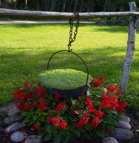 Декоративный костер своими руками Для создания декоративного костра необходимо выложить камни по кругу. Диаметр круга любой. В этом круге посадить красные цветы – сальвию в два ряда по кругу и посередине, которые в итоге выступят в роли пламени костра. Поливать каждый день. Сделать из веток подставку под котелок и установить посередине круга. В котелок насыпать земли и посадить туда травы или седумы. Не забывайте поливать, чтобы не было желтых и сухих веточек. Повесить котелок на подставку. В середине июля красные цветы сальвии подрастут и расцветут и будут смотреться как пламя огня, а котелок, словно в нем варится уха или каша.