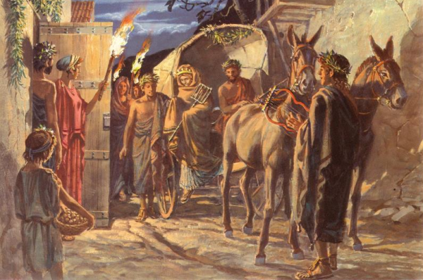 В свое время древние греки создали одну из величайших цивилизаций в истории человечества. Достижениями эллинской культуры, архитектуры, скульптуры до сих пор восторгаются во всем мире. Жизнь древних греков, как и всех языческих народов, содержала в себе большое количество ритуалов и обрядов. Многие из них были утрачены за прошедшие тысячелетия, но о некоторых нам известно и сейчас. Свадебный обряд Женились древние греки обычно зимой. Обряд носил ритуальный характер и строго соблюдался в течение многих веков. Самому бракосочетанию предшествовала помолвка, сопровождавшаяся молитвами и жертвоприношениями у домашнего алтаря. Юная невеста посвящала свои молитвы покровительницам женщин – Гере и Артемиде. Занимательный факт. В Древней Греции мальчишник устраивался не до, а после свадьбы, на следующий день. Молодой муж устраивал праздничное застолье для мужчин из своей фратрии. Городские выборы Одним из самых главных подарков древнегреческой цивилизации современному миру является демократия