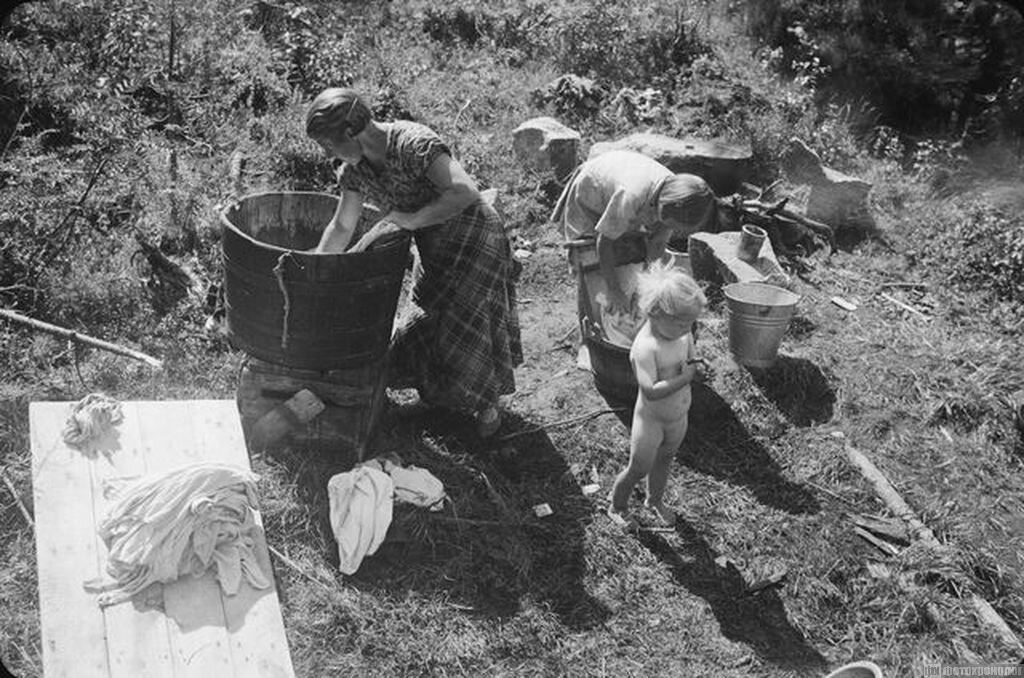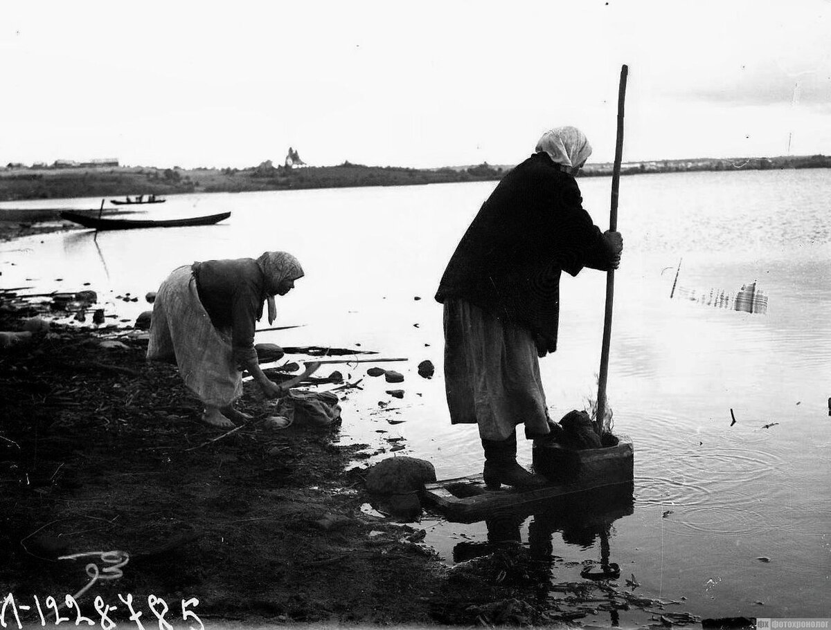 Страшно представить, но ведь раньше не было никаких стиральных машинок, все приходилось стирать руками. Да что там машинки, во многих местах в принципе отсутствовало центральное водоснабжение; в домах не было раковин, из которых бы лилась вода. И это я не говорю про теплую воду. Никакой, даже холодной не было. Все это появилось совсем недавно. А если говорить про деревни, то ведь по сути еще в середине прошлого века все стирали "дедовскими методами" - в лохани на своем дворе, или вовсе на реке. А кто-то так стирает до сих пор. Вот тут можно посмотреть несколько фото, показывающих непростой процесс стирки в карельских деревнях в первой половине прошлого века. Стирка в деревянной лохани. Тут тоже стирка. Одна из женщин "толчет" шестом домотканную одежду в специальном корытце, другая - бьет вальком белье. Тут, видимо, женщины разложили белье на камне и мылят его. А здесь они это белье полоскают. Вот, наконец все выстирано. Кто-то положит чистое белье в плетеную корзину. А кто-то понесет