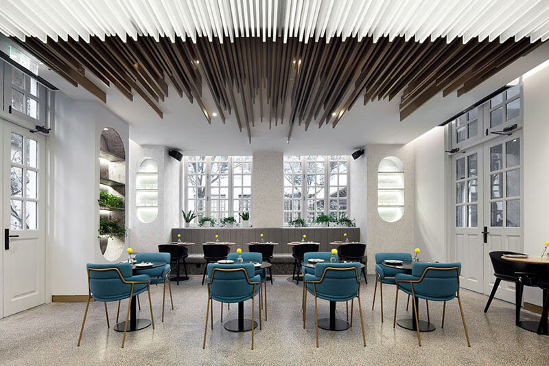Coordination Asia недавно завершила свое последнее сотрудничество с сетью ресторанов и кафе Gaga, которые расположены внутри исторической виллы в самом центре Шанхая, Китай. Построенная в конце 19 века, вилла когда-то была христианской школой для девочек, однако теперь это яркое и гостеприимное кафе-ресторан, раскинувшийся на двух этажах. Зона кафе расположена на первом этаже, с сервисной стойкой на одной стороне комнаты открытой планировки и зоной отдыха на противоположной стороне. Темно-синие стены соответствуют синим банкетным креслам, которые оборачивают гостиную, создавая яркий контраст с белыми стенами и потолком. Также на первом этаже находится барная зона с черными акцентными стенами, которые соответствуют черным стульям, и драматическим освещением Lamella на потолке. Выделенные использованием белых стен и плитки — это комнаты отдыха. Это вид на лестницу, ведущую на второй этаж пространства, в котором находится ресторан. Наверху, оригинальный потолок был сохран