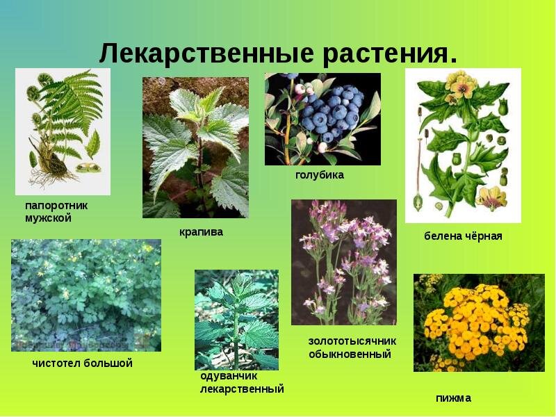 - Лекарственными растениями называют растения, которые применяются для лечения людей или животных или же употребляются в качестве сырья для производства лекарств. Из известных на Земле 500 000 видов растений более 12 000 составляют лекарственные, целебные свойства которых используются в современной научной медицине. Современная отечественная медицина использует 230 видов лекарственных растений, из них в культуре возделывают лишь 50 (22%). В настоящее время около 40 % всех лечебных средств, поступающих на мировой рынок, изготавливается из сырья «зелёной аптеки». «Зелёная фабрика» природы сотни тысяч лет снабжает человечество надежными лечебными средствами, не вызывающими, в отличие от синтетических, побочных явлений. Препараты из лекарственных растений нередко бывают единственными при многих заболеваниях. Лечение травами – фитотерапия – мощное средство борьбы за здоровье людей. Этим объясняется сейчас большой спрос на такие растения, как подорожник, ромашка, ландыш, бессмертник, мать-и-мачеха и многие другие.