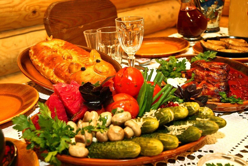 Издревле и в течение многих столетий простые русские люди употребляли в пищу практически одно и то же. Их меню состояло прежде всего из ржаного, реже пшеничного, хлеба, каши, овсяного киселя, различных овощей. Мясная пища была обильна и доступна для всех: кроме домашних животных и птиц, употреблялась всякого рода дичь, которой было полно в лесах. Реки и озера изобиловали вкусной рыбой. Ели также мясо медведей и белок, но против этого сильно восставало духовенство (служители церкви), считая этих животных «нечистыми». Оно еще запрещало есть «давленину», то есть тех птиц, которые не были зарезаны или застрелены, а удавлены силками. Во время праздников большим почетом пользовались пироги и блины. О пряностях (соли, перце, корице) на Руси не знали очень долго. Не слыхали и про обыкновенную картошку. Ее начали выращивать только с ХVIII века. Из напитков русские люди употребляли в основном различные сорта кваса, браги, пива, меда. Заморские же вина были доступны только очень состоят
