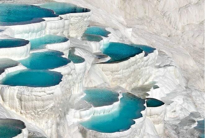 1. Памуккале, Турция Пожалуй, каждый турист, приезжавший в Турцию, слышал о данной достопримечательности. Памуккале на сегодняшний день представляет собой ряд термальных источников, благодаря природным явлениям высекших «ступени» в белоснежном известняковом склоне. Температура воды в источниках Памуккале в Турции круглый год выше 35 градусов. Среди доступных для купания одной из самых популярных является «Бассейн Клеопатры». Находится данная достопримечательность в дали от туристических центров, поэтому, отправляясь сюда из ближайшего курортного города, будьте готовы к продолжительной поездке. Но, к сожалению, хрупкие стенки известняковых травертин чувствительны к повреждениям, и по многим из них ходить категорически запрещено. Для того, чтобы пройтись по остальным, придется снять свою обувь. За соблюдением этого правила внимательно следит специальная поставленная там охрана. Помимо этого,весь источник охраняется государственной охраной. Местность, в которой расположен этот необыча