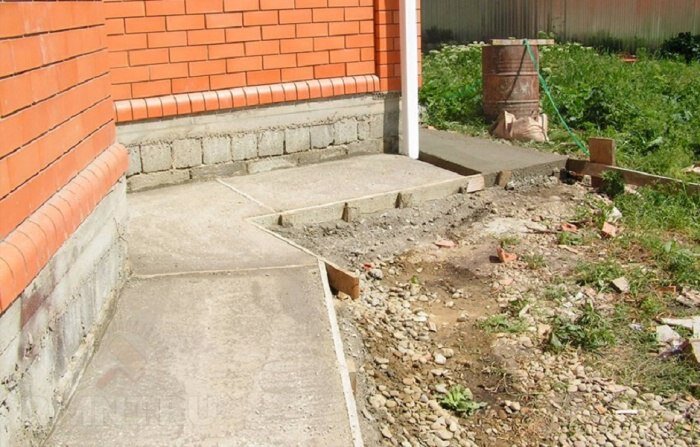Эксплуатация монолитных изделий продолжается весь период службы здания. Но возведение бетонной защиты вокруг дома сопровождается негативными моментами: