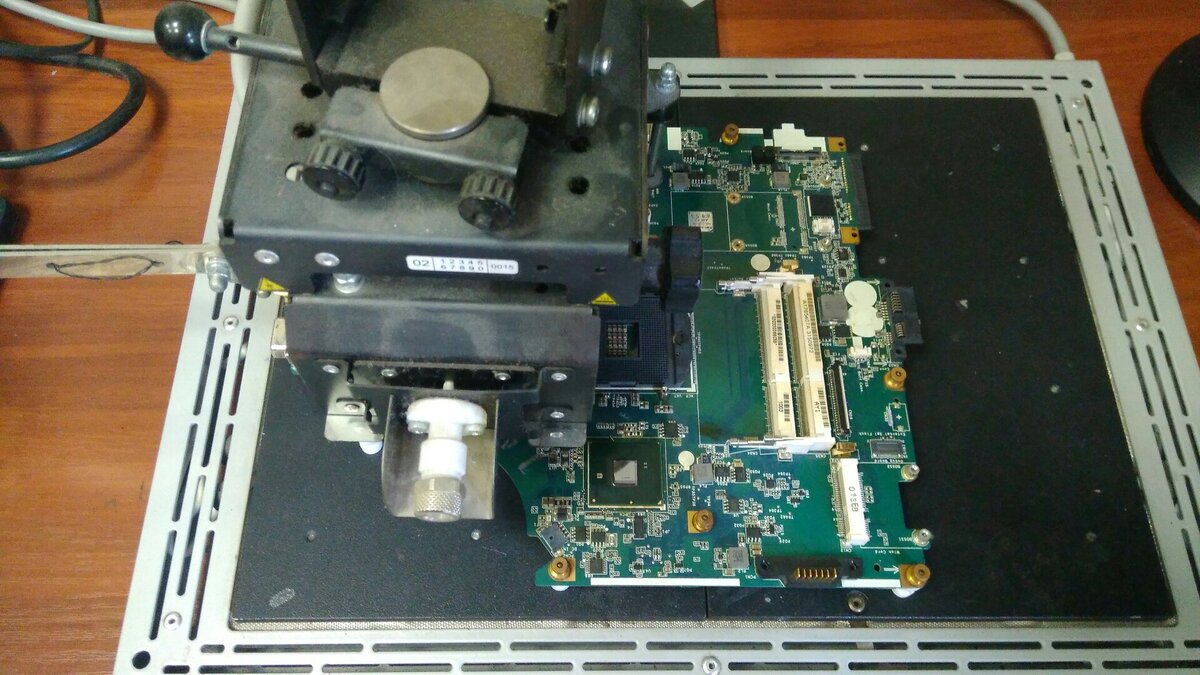 Разбираем ноутбук, снимаем материнскую плату, визуально осматривает плату, косяков конечно много, оторвано крепление охлаждения видеокарты, отломаны выключатель wi-fi, и вот оно- сколот кристалл видеочипа, в этом и заключается проблема. И так неисправность нашли, на чипе маркировки нет(( по схеме определили наш видеочип, к сожалению такого у наших поставщиков не оказалось. Нашли совместимый, заказали. Приступаем к замене: плату на термостол нашей ИК станции ТермоПРО, по термопрофилю отпаиваем неисправный видеочип, убираем остатки припоя с контактных площадок, ждём пока плата остынет, устанавливаем новый чип, так же по термоп