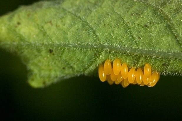 Период яйцекладки колорадских жуков может длиться около трех месяцев, когда самка жука откладывает яйца, их может быть до 700 штук. Вы, наверное, не раз видели, как усеяны ярко-желтыми яйцами нижняя сторона листьев и молодые побеги. Вот эти яйца через небольшой период времени превращаются в личинки, которые расползаются по кусту, объедают листья. Питаются они очень активно примерно месяц, а потом сползают к почве, неглубоко зарываются и окукливаются.