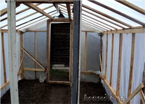 Они втыкаются в землю на одинаковом расстоянии. Сверху привязывается рейка, удерживающая пленку от провисания. Она придает парнику жесткость, как и каркас из боковых досок.
