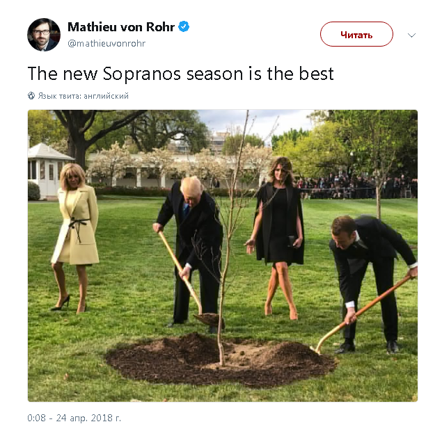 "О нет! На фоне других мировых скандалов, теперь, по-видимому, дерево Макрона у Белого дома исчезло всего через несколько дней после того, как он его посадил!"- написал в своем твиттере корреспондент FRANCE24 Стюарт Норвал.