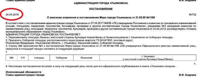 27 апреля сайт ulpravda.ru разместил результаты опроса, проведенного среди ульяновцев по вопросу переименования площади Ленина в Соборную.Депутат ЗСО Василий Гвоздев, которому, похоже, все советское жить спокойно не дает, в тот же день разместил на своей странице репост этой информации. А через день по местному сегменту "фейсбука" пронеслось: переименовали! Так события выглядели внешне. А на деле все было иначе. Сначала переименовали, потом провели опрос, и только потом о переименовании заговорили как о свершившемся факте. То есть, говоря открытым текстом, ульяновские власти всех горожан поимели, что называется, с особым цинизмом и в извращенной форме. Роль "крайнего" и ответственность за это надругательство взял на себя и.о. главы городской администрации Вадим Андреев, подписавший Постановление №732 от 24 апреля 2014 года. Но его ли следует винить? Известно, что в важных решениях (а переименование площади Ленина несомненно является решением важным) власти Ульяновска без оглядки