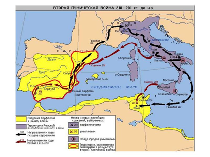 218 л. до н.э. Вторая Пуническая война, битва при Каннах и победа карфагенского полководца Ганнибала (при полном окружении противника), но выиграв битву, Ганнибал проиграл войну, после битвы при Заме, Карфаген запросил мира и отдал Испанию Риму.