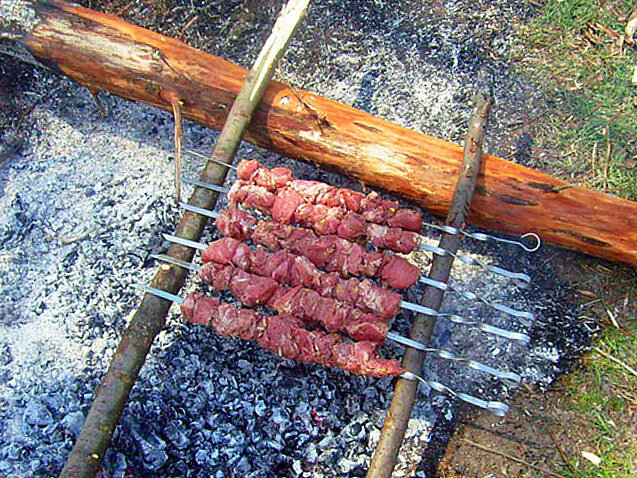 Часто бывает, что в спешке собираясь на долгожданную природу компанией, забывают самое важное - мангал! Вроде, все купили: мясо, специй, овощей, винца, всякие средства от клещей, а мангал забыли! На самом деле, ничего страшного нет, просто придется потратить несколько минут и соорудить настоящий походный вариант. Вот самый примитив, который можно себе представить. Разводите костер, а когда он прогорит до нужных углей, подкатываете бревнышко и укладываете на него пару толстых палочек. Такой вариант хорошо работает в безветренную погоду, потому что у него нет боковых стенок. Можно поработать немного лопатой и выкопать мангал в земле. Когда в нем будут гореть дрова, то земельные стенки запекутся, станут прочными и наберут жара. Это самый лучший вариант походного мангала: на нем можно не только пожарить мясо, но и запечь что-нибудь, потому что земля держит мягкий жар долго, получится как в духовке. А этот вариант для тех, кто решил устроить шашлычок где-нибудь в гаражах с пацанами / мужик
