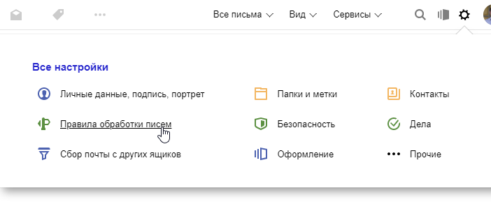 Вот же навязались на мою голову! Как же просто оказывается избавиться от такого имея яндекс почту В ящике рядом с авой верхнем правом углу потом жмем: правило обработки писем