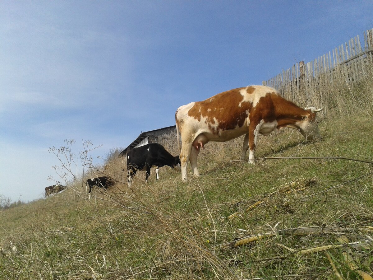 Зимой у нашего пастуха Геннадия случился инфаркт. Обошлось. Быстро довезли. Без последствий. Но пасти коров , категорически , запретили. И вот мы сами стали пастухами у своих коров. Вчера подопечные бегали как Савраски , сегодня они идут старыми , тайными тропами. Если вы думаете , что коровы ходят там , куда их гонят , то ошибаетесь. Они бродят не как положено , а вопреки. А начиналось всё так прилично. Пришли в пойму речки , я даже на лавочке посидела. Рыба булькает. Потом коровы стали скрываться из вида. Перемахнули через дамбу. И были таковы. А ты посиди , хозяйка. Шишкова почитай. Течением полюбуйся. Всё ничего , да уж ,больно ,бережок болотистый , после разливов. Не просох ещё. Пастуховские-то коровы за семью замками , поэтому поводу , сидят. Туда и отправились мои коровы. Поздороваться , да с собой позвать , бедняжек. Но подружки крепко заперты. Если только повалят забор? Провожают нас , бегут вдоль забора. Скучно , бедняжкам взаперти сидеть. Но болота не подс