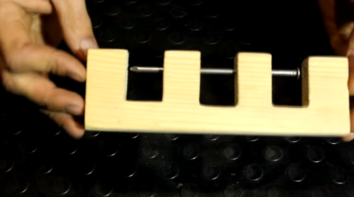 Всем привет! Сегодня я вам покажу как сделать головоломку которая вызовет удивления у друзей, родственников когда вы им покажете готовое изделие. Головоломка "как вытащить гвоздь?" Для этого нам потребуется доска у которой волокна идут вдоль доски, это важно... Ну и конечно же гвоздь, кипятильник или электрическая плитка, тиски, вода и сосуд (кастрюля сгодится) 1 делом делаем разметку на доске и вырезаем лобзиком и стамеской нужную нам заготовку... Должно получиться 4 "зубчика" как на 1 фото, два центральных под наш гвоздь. Далее наш брусок одним крайним зубчиком закидываем в слегка кипящую воду и кипятим примерно 3 часа... Зажимаем отваренный зубчик в тисках и держим 1 час в таком положении... После этого берём дрель или мощный шуруповёрт и делаем отверстия в центральных зубьях под гвоздь, ну и пихаем туда сам гвоздь... Повторяем процедуру кипячения и дерево примет свою прежнюю форму. На этом всё, наша головоломка готова :-) Автор: канал George Kosilov