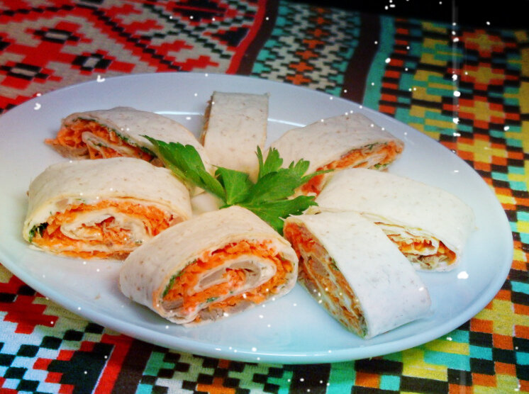 Затем кладем лист лаваша, мажем его майонезом, высыпаем сверху сыр,морковку и зелень.