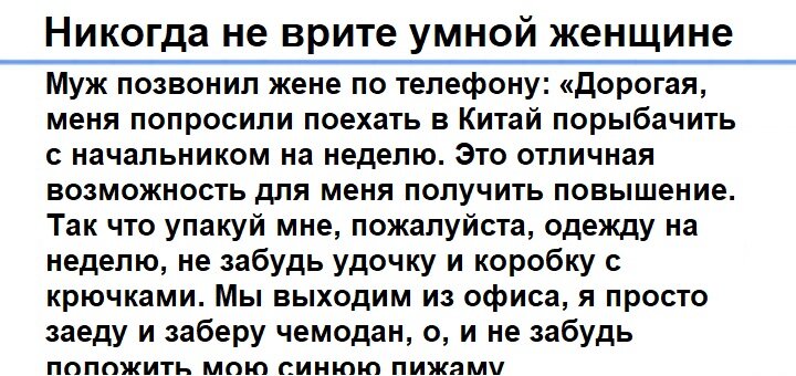 У женщин особый ум, у них сильная интуиция, которую мужчинам зачастую не понять. Поэтому мы советуем Вам никогда не врать женщине, они найдут способ узнать правду. Эта история еще раз доказывает это. Однажды муж позвонил жене и спросил: «Дорогая, меня попросили поехать в Китай порыбачить с начальником на неделю. Это отличная возможность для меня получить повышение. Так что упакуй мне, пожалуйста, одежду на неделю, не забудь удочку и коробку с крючками. Мы выходим из офиса, я просто заеду и заберу чемодан, о, и не забудь положить мою синюю пижаму» Жена поняла, что что-то здесь не то, но она решила ничего не показывать и сделала то, о чем ее просил муж. Через неделю муж вернулся домой и сказал, что отлично провел отпуск с начальником, они каждый день рыбачили и наслаждались покоем. Жена расспрашивала о том, понравилось ли ему, она хотела знать детали, удалось ли им поймать рыбу. Муж ответил – «Да, мы поймали много лосося, нам попался и синежаберник… Но почему ты не положила в чемодан