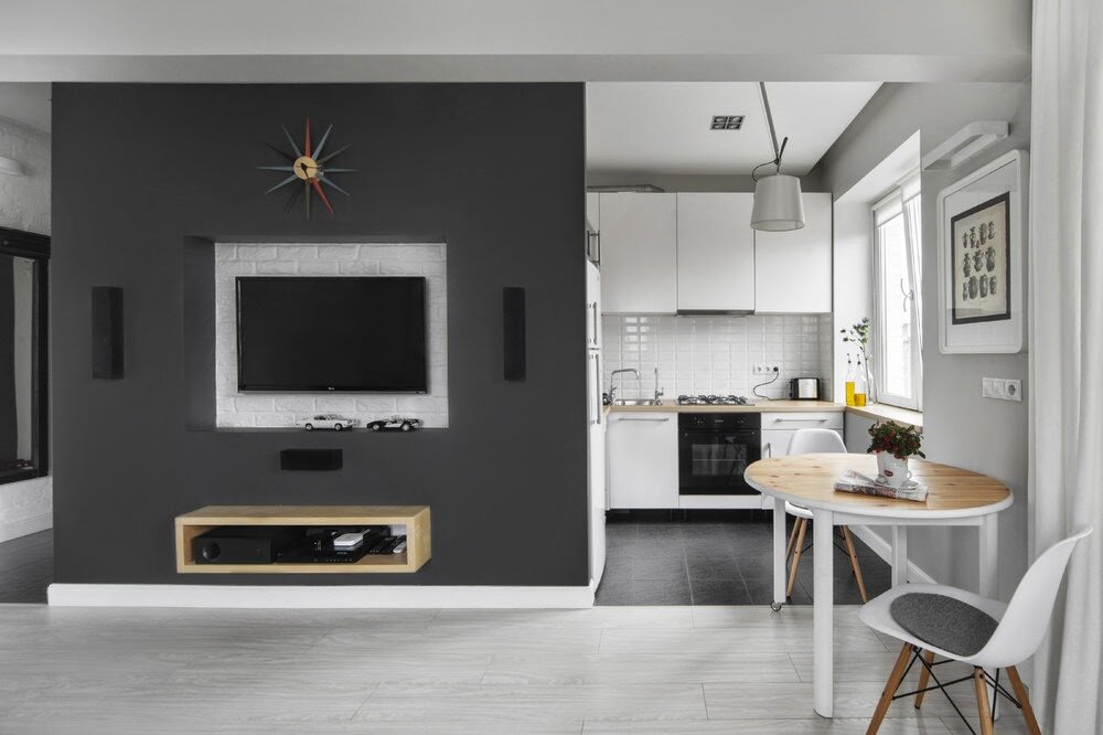 Продолжаю радовать посетителей блога фотографиями однокомнатных квартир с конкурса PinWin. Сегодня изучаем Маленькую квартиру в хрущевке 1960-х годов постройки. Дизайнеры решили сложную задачу организации пространства на отлично, присутствуют все необходимые зоны. Использован бело-серый цвет с акцентами натуральных материалов. Предусмотрено много мест хранения, удачно и уютно организована зона отдыха на балконе.