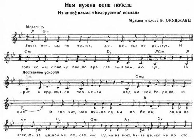 Кажется, это одна из самых любимых народом песен, исполняемых на День Победы. Булат Окуджава сочинил её для фильма «Белорусский вокзал», посвятив режиссёру Андрею Смирнову, а Альфред Шнитке написал оркестровку. Другое название песни — «Мы за ценой не постоим».