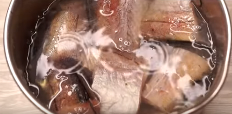 Всем привет. Хочу поделиться с вами рецептом, от которого вы будете в полном восторге. Готовим очень вкусный рыбный салат. Все, кто пробует этот салат, не могут угадать, что здесь за рыба, а когда узнают, не могут поверить. Набор продуктов минимальный, а готовится очень просто. Кухня. Берем две средние рыбки минтая,весом около 800 гр., можно заменить на треску или хек. Чистим, моем, нарезаем на небольшие кусочки и кладем в кастрюлю. Теперь нам понадобится рассол от маринованных огурцов, домашних или магазинных, без разницы. Заливаем рыбу огуречным рассолом так, чтобы рыбка хорошо скрылась. И ставим варить до готовности. Через минут 5-7 после закипания,снимаем с огня и даем рыбе полностью остыть в рассоле. Лучше всего это делать на ночь. Сварили и оставили остывать. Как только рыба остыла, полностью, убираем ее из рассола,очищаем от косточек и руками разминаем на пластинки. Далее, берем две средних луковицы, режем тонкими четверть кольцами. Отварные яйца,3 штуки,режем кубиками. Бе