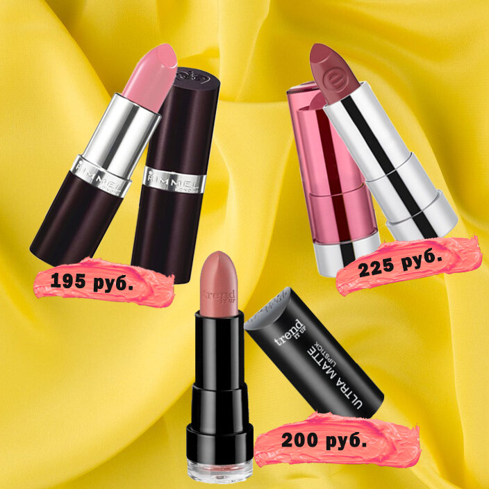 Помада - это тот продукт который мы наиболее часто используем в повседневной жизни. Иногда очень сложно найти хорошую помаду среди огромного количества различных помад представленных в магазине. Главные качества для помады это конечно же стойкость, приятная текстура и хорошая пигментация. Я собрала для вас подборку помад, которые отлично ложатся на губы, не сушат их а главное стоят дешево. 1. Rimmel Lasting Finish в оттенке 070 Airy Fairy. Примерная цена 195 руб. Хорошо смотрится на обладателях светлой кожи. не скатывается не стекает с губ, не очень стойкая, но поскольку у нее кремовая текстура это не удивительно, и легко исправимо. C мелким шиммером который слегка придаст объем вашим губам. 2. trend it up matte в оттенке 400. Примерная цена 200 руб. Помада достаточно пигментированная и кремовая, по качеству не уступает дорогим производителям. 3. Matt Matt Matt! Lipstick в оттенке 03 WOW Effect. Примерная цена 225 руб. Эта помада имеет бархатистую, приятную текстуру. Цвет пома