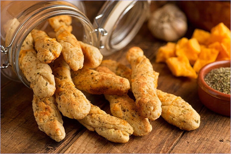 Из сыра Чеддер и слоеного теста приготовить можно замечательную выпечку, в которую дополнительно добавить можно еще кайенский перчик, а также семена фенхеля, мак и кунжутные семечки. Такая хрустящая и великолепная закуска с сыром подойдет идеально для всей семьи, причем, запеченные сырные палочки можно будет поставить для большей красоты в стакан с высокими стенками.