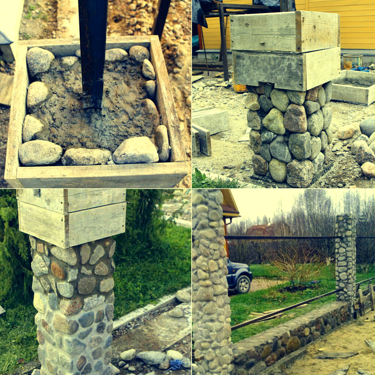 Обычно, природный камень нужно подгонять друг к другу и это очень трудоёмко и требует большой аккуратности. Но если сделать такую простую коробочку (кондуктор) из пары досок, то заморачиваться с укладыванием камней не придется: они всегда «поймают» плоскость и не будут выступать. Останется лишь забетонировать внутренность столба, чтобы бетон связал наши камни в один монолитный столб.