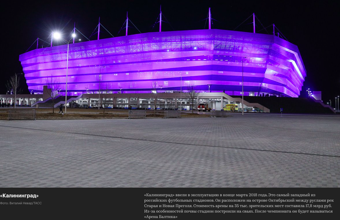 Чемпионат мира по футболу в России пройдет с 14 июня по 15 июля. Проведение ФИФА запланировано на 12 стадионах 11 городов страны. Как сообщает интенет-издание RU.DELFI, cамый большой из них — "Лужники" (81 000) в Москве. Второй по величине — в северной столице (67 800). "Калининград" - работает всего 1 месяц, бюджет 17,8 млрд Арена на 35 тысяч зрителей стоит на острове Октябрьский между руслами рек Старая и Новая Преголя в Калиниграде. Стадион построен на сваях из-за особенной геологии. После чемпионата арена будет называться "Арена Балтика". "Самара Арена" - самый большой стадион к ЧМ-2018, бюджет 18,2 млрд Высота стадиона "Самара Арена" - 156 тысяч кв. м. и рассчитан на 44,9 тысяч зрителей. Стадион расположен в самой высокой точке и напоминает по форме космический корабль. Эта концепция связана с достижениями Самары в аэрокосмической отрасли, а именно лифт-трос до Луны, запуск самого маленького спутника АИСТа для исследования космического мусора, запуск манекена Ивана Ивановича пере