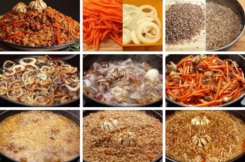 Промыв, перебранный рис 3-4 раза, замочить в подсоленной горячей воде за 2 часа до приготовления плова. Очищенную морковь нашинковать соломкой, лук - кольцами. Мясо нарезать кусками по 100-150г или ломтиками по 10-15г. В раскаленный жир положить сначала мясо, перемешивая, обжарить до слабой корочки, чтобы оно не потеряло сочность. Положить лук и жарить на умеренном огне, перемешивая время от времени. Когда из мяса и лука в масло выделится сок, положить ровным слоем нашинкованную морковь и, не перемешивая с мясом, сразу залить водой, посыпать специи и дать закипеть, запр
