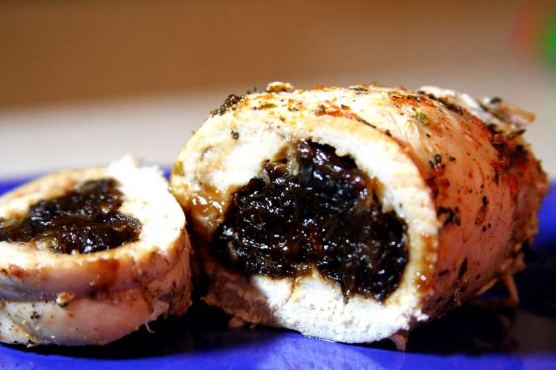 Блюдо, которое хочу предложить вашему вниманию не требует много времени для приготовления,но будет эффектно смотреться на праздничном столе. ИНГРЕДИЕНТЫ: Филе курицы - 300 г Орехи(любые) - 50 г Чернослив - 100 г Консервированные персики - 200 г Соль,специи,чеснок. ПРИГОТОВЛЕНИЕ: Чернослив размочить в холодной воде. Филе курицы разделить на порционные куски шириной около 10 сантиметров и замочить их в соке консервированных персиков на 30 минут. Каждый кусочек посыпать рубленным орехом,положить чернослив (2-3 шт.на кусок) и завернуть рулетики. Сформированные рулетики слегка натереть чесноком,посолить, посыпать приправой (по желанию). Завернуть рулетики в пищевую фольгу и поставить в духовку на 30-40 минут. Готовые рулетики разрезать на кружочки,выложить на блюдо вместе с консервированными персиками. Это блюдо может служить закуской,горячим блюдом или даже десертом. Надеюсь, Вам тоже понравится. Приятного аппетита!