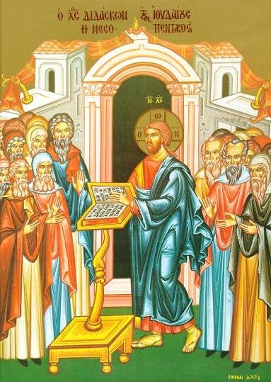 В этот день вспоминается событие из жизни Спасителя, когда Он в Преполовение ветхозаветного праздника Кущей вошел в церковь и учил. (Ин. 7:14-36).