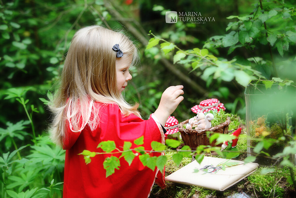 В назначенное время именинницу привели на сказочную полянку, чтобы она окунулась в атмосферу волшебства. Ей одели красненькую накидку и рассказали, что сейчас начнется большое приключение. Аленка с большим интересом осмотрела все вокруг.