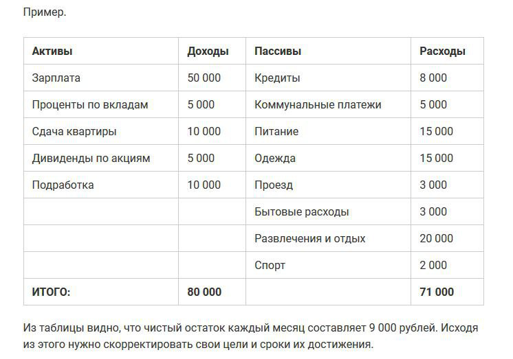 У большинства людей его НЕТ Но мы с Вами его составим и постараемся понять значимость. 1. Составление финансового плана всегда нужно начинать с определения целей. То есть того, чего вы хотите достичь. Цели могут долгосрочные и краткосрочные. Например, в моих планах: - новая машина Mersedes за 40 000$ долларов; - 3-х комнатная квартира в центре своего города за 8 миллионов рублей; - отпуск 150 000 рублей. Так мы имеем конкретные цели. И теперь становится более понятно сколько нужно денег для их достижения. 2. Сроки достижения Теперь нужно определить время, в течении которого вы планируете их достичь. Когда нет точных сроков, цель становится нечто призрачной и далекой. Конкретно по вышеперечисленным примерам, можно сделать так: - машина Mersedes через 3 года; - квартира через 2 года; - отпуск – сентябрь этого года. Сроки и цели нужно устанавливать реальные. 3. Активы и пассивы Вам нужно определить для себя сколько денег вы можете откладывать ежемесячно. Для начала нужно определить