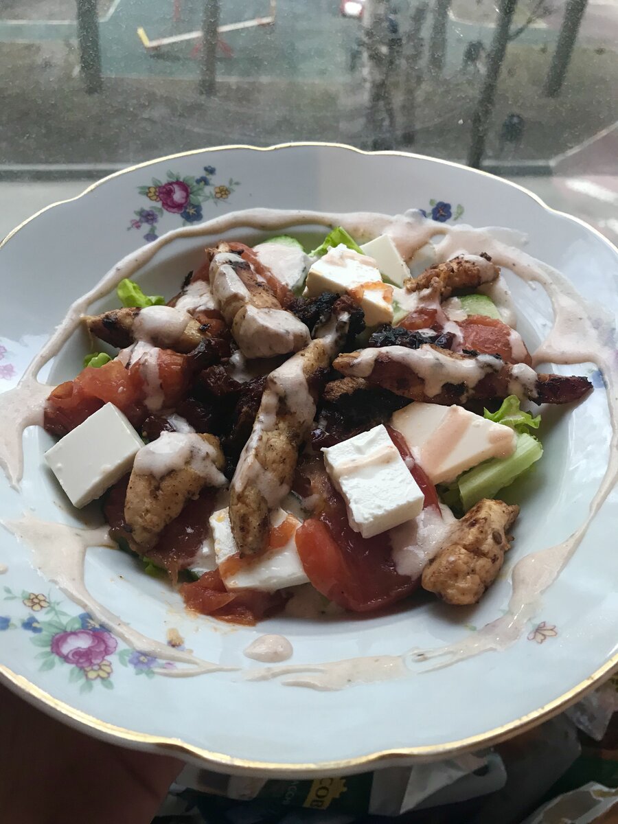 Один из несложных гастрономических изысков! Время приготовления - 30 минут. Для одной порции нам понадобится: -Куриное филе - 1 шт; -Зелёный салат; -Половина помидора; -Половина огурца или один маленький; -Вяленые томаты; -Брынза; -Йогуртовая заправка (Bio-баланс или приготовленная самостоятельно); -Томатный соус; -Чеснок; -Приправы(перец, для курицы) Приготовление: 1) Курицу нарезаем на средние кусочки; 2) Разогреваем сковородку и добавив немного масляного соуса из банки с вяленными томатами или просто оливкового масла, обжариваем около 1 минуты чеснок; 3) Добавляем курицу; 4) Посыпаем приправами и солью; 5) Обжарив с двух сторон кладём в сковородку нарезанные вяленые томаты. Тушим под крышкой 10-15 минут; 6) В это время нарезаем салат, огурец(колечками) и помидор(колечками) . Не смешиваем; 7) В тарелку выкладываем салат и сверху огурцы. Пришло время заняться заправкой: 1) 2 столовые ложки заправки смешиваем с 1,5 чайной ложки томатного соуса; 2) Добавляем пол чайной ложки масляно