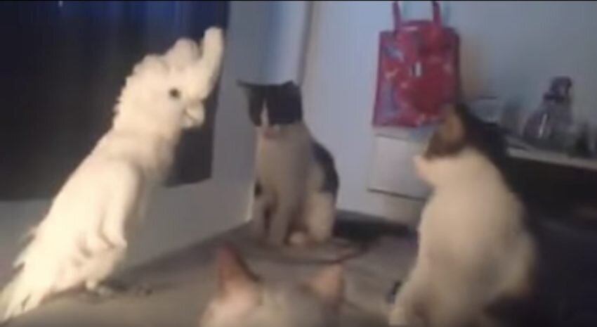 Курицы кудахтают, коровы мычат, а птицы чирикают – вот чему учили всех нас в детстве, не так ли? Ну, возможно, наши родители и учителя знали далеко не все, хотя в то время мы верили в обратное. В этом смешном видеоролике домашний попугай решает присоединиться к своим кошачьим друзьям и немного поговорить с ними. И пернатому удалось внести смуту в кошачье общество! Кошки смотрят на попугая, а он смотрит на них. И когда птица открывает клюв, из него доносится тихое…мяу! Кошки просто в замешательстве! Попугай еще пару раз мяукает, чем удивляет кошек еще больше. Да, этот пернатый, безусловно, смог шокировать пушистиков! Когда вы посмотрите видео, вы точно не отличите его мяуканье от звуков, которые издает настоящая кошка. Когда кошки немного приходят в себя, одна из них пытается подойти к попугаю. Но тут он начинает имитировать змею! Попугай шипит и кот отступает. Вероятно, этот попугай настоящий пародист… Три кота просто в шоке. Они не думали, что один попугай так быстро и ловко поставит
