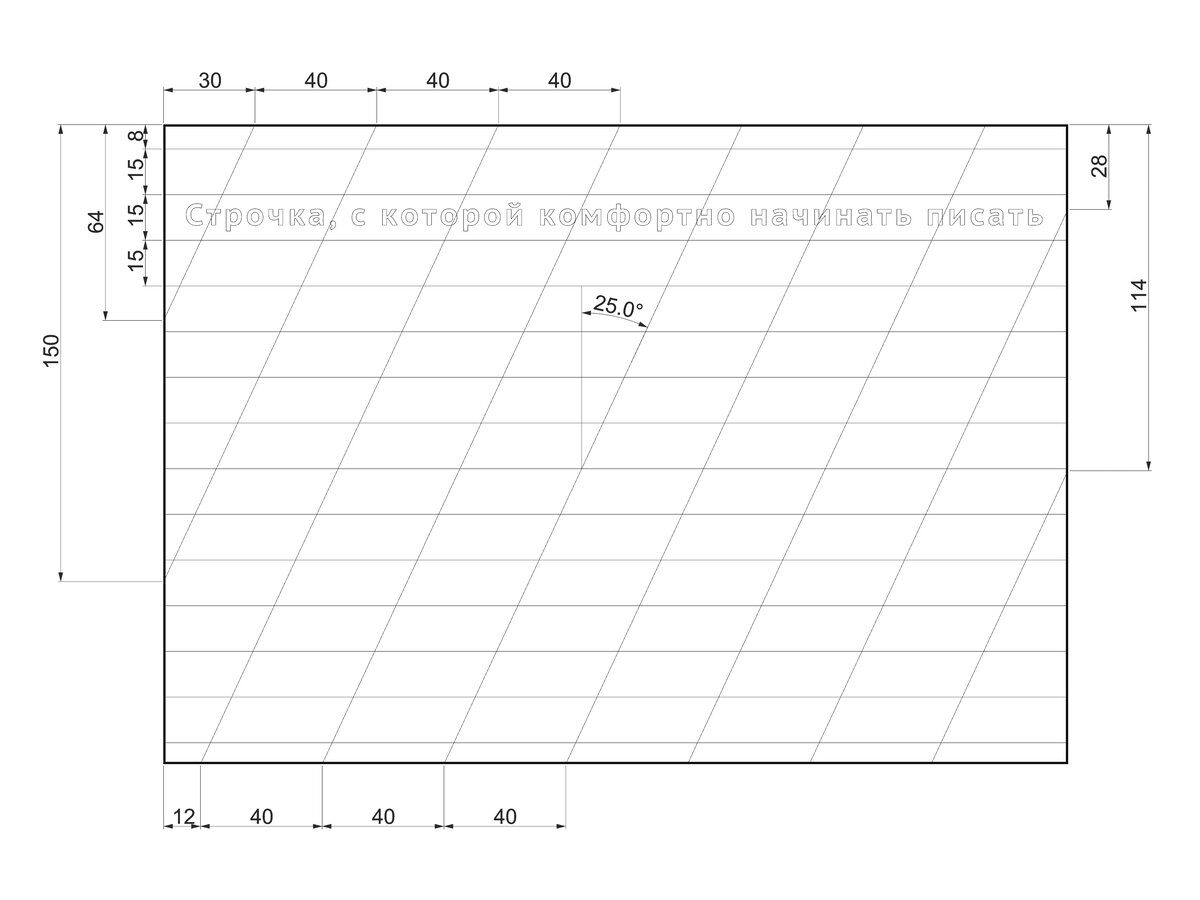 Формат листа А4. Высота строк 20 мм. Расстояние между направляющими 40 мм. Наклон направляющих 25".