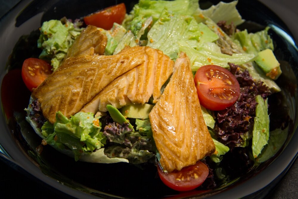 Салат с жареным лососем - вкусное, полезное и очень сытное блюдо. Между прочим, может заменить весь обед. Сделаем его пряным, восточным. Добавим огурцов, авокадо и зелени. Будет вкусно и интересно! ИНГРЕДИЕНТЫ 1. Нарежьте филе лосося небольшими кубиками. 2. В мисочке смешайте соевый соус, рисовый уксус, мирин и сахар. Мешайте до растворения сахара. Замаринуйте в полученной смеси кусочки лосося на несколько минут перед жаркой. Затем обжарьте лосось на сковороде без масла. 3. Салатные листья промойте и нарежьте (лучше - просто порвать). Авокадо очистите и нарежьте кубиками.Порезать помидорку Черри пополам. Зеленый лук промойте и измельчите. Лук промойте, очистите и нарубите тонкими полосами. Обжаренные кусочки лосося выложите в миску. В сковороду с маринадом добавьте уксус. Потомите несколько минут, затем полученной глазурью полейте лосось. Добавьте к кусочкам лосося приготовленные овощи. 4. Салат с жареным лососем подавайте порционно или в салатнице. Приятного аппетита!