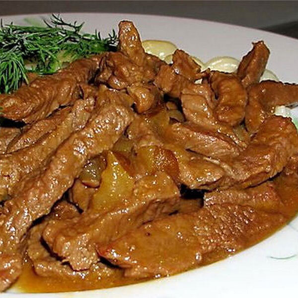 Это необыкновенно вкусное второе блюдо, которое является одним из самых любимых в нашей семье. Бефстроганов — это популярное блюдо русской кухни. Именно для хлебосольных обедов было изобретено это блюдо в конце XIX века в Одессе при дворе графа Строганова, который очень любил принимать гостей. Блюдо достаточно просто и достаточно быстро готовилось из самых простых продуктов, но при этом было сытным и удобным в употреблении. Название этого блюда переводится как говядина по-строгановски, поэтому классический бефстроганов готовится только из мяса говядины. Ингредиенты: Вырезка говяжья 600 г Лук репчатый 2шт. или 1 шт. очень большая! Сметана 3-4 ст. л. Томатная паста 2 ст. л. Соль, перец, кориандр и др. травы по вкусу Растительное масло для зажарки Приготовление Для приготовления блюда берется самая лучшая и свежая говяжья вырезка. Моем, обсушиваем бумажным полотенцем, тщательно удаляем все пленки. Нарезаем мясо поперек волокон пластинами толщиной 10 мм. Пласт