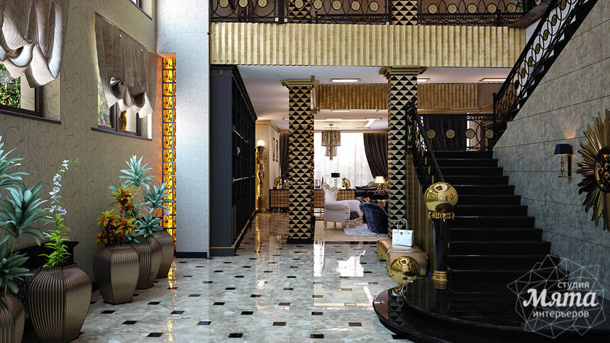 К нам обратился владелец особняка в Краснодаре, которому нашу студию порекомендовали его партнеры из Екатеринбурга. Он заказал элитный дизайн коттеджа в восточном стиле, но в современной трактовке. Площадь дома превышала 400 кв.м. и на работу было выделено три месяца. Был разработан дизайн интерьера коттеджа в стиле арт-деко, в котором доминантную роль была отведена Древнему Египту с его роскошью и контрастным сочетанием в интерьерах черного цвета и золота. Холл и столовая: встречаем гостей роскошью Востока Просторный холл украсили колонами, сделав акцент на мозаику с сочетанием черного и золотистого цвета. Лестницу со ступенями из черного гранита украсили балясинами с крупными золотистыми шарами. Стены оформили обоями с золотистым рисунком флористического стиля. Вдоль свободной стены установили экзотические живые растения в оригинальной восточной керамике, придав дизайну интерьера дома необходимый для арт-деко колорит. Уютную столовую дома с панорамным остеклением украсили черными д