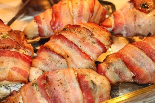Куриная грудка — настоящее полотно для творческих кулинаров. Кажется, нет ингредиента, с которым его нельзя было бы сочетать. Обычно курятину используют для приготовления низкокалорийных диетических блюд, но мы решили сделать исключение и рассказать вам об одном очень крутом рецепте, о калорийности которого лучше не задумываться. Куриные рулетики в беконе с грибной начинкой идеально впишутся в ваше праздничное меню. Нежное мясо, хрустящий бекон и сочная грибная начинка точно не оставят никого равнодушным. Такую вкуснятину должен попробовать каждый! Ингредиенты Сливочное масло 15 г Шампиньоны 150 г Шалфей 10 г Куриная грудка 4 шт. Сливочный сыр 150 г Дижонская горчица 1 ч. л. Бекон 150 г Соль по вкусу Черный перец (молотый) по вкусу Приготовление Поздравляем, восхитительная курятина в беконе готова! По желанию можете добавить в начинку тертый твердый сыр либо же кусочки моцареллы, тогда грибная смесь получится еще более сытной и