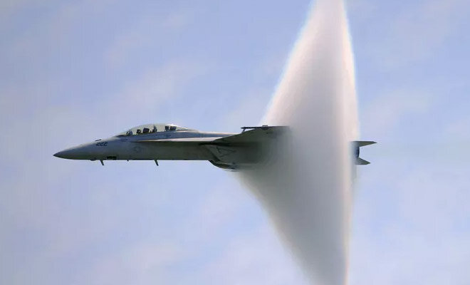 И когда самолет набирает скорость звука все резко меняется он как бы прокалывает этот пузырь при этом резкий хлопок происходит перед самым носом самолета и появляется необычный оптическое явление . Прохождение через газовый пузырь На видео показан один из таких эффектов